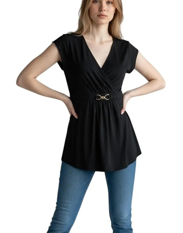 New York & Company Y2K Babydoll Top Womens Size S Black Gold Tone Buckle Stretch Casual Excellent pre-owned condition V neckline Cap sleeves Faux-wrap design at the front Gathered fabric at the waist Decorative gold-tone buckle detail 95% Polyester, 5% Spandex Turn garment inside out. Machine wash cold pit to pit 16.25" length 27.5" timeless, corpcore, office siren, party, whimsygoth, versatile, night out