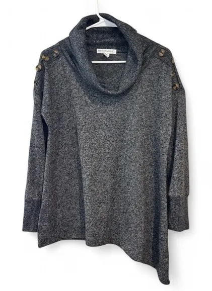 Gray Cowl Neck Sweater from New York Laundry. This soft, stretchy ribbed knit pullover is a fantastic, comfortable piece for your cold-weather wardrobe. Key Design Details: Elevated Accent: Features unique tortoise shell-style button details along the shoulders, giving the classic piece an elevated, sophisticated look. Comfortable Knit: Made from a soft, stretchy blend of Polyester, Rayon, and Spandex for comfortable wear. Relaxed Fit: Designed with a relaxed fit, long sleeves, a comfortable cowl neck, and an asymmetrical hemline. Item Details: Brand: New York Laundry Size: Women's Medium (M) Color: Gray Fabric Type: Polyester, Rayon, Spandex (Soft, stretchy ribbed knit) Features: Cowl Neck, Shoulder Button Detail, Asymmetrical Hem Approximate Measurements (taken flat): Length (Asymmetrical): 23 inches Sleeve Length (Shoulder to Cuff): 24 1/2 inches Condition & Storage: Condition: Gently worn, in excellent use condition. It has been carefully stored from a pet free, smoke free home.
