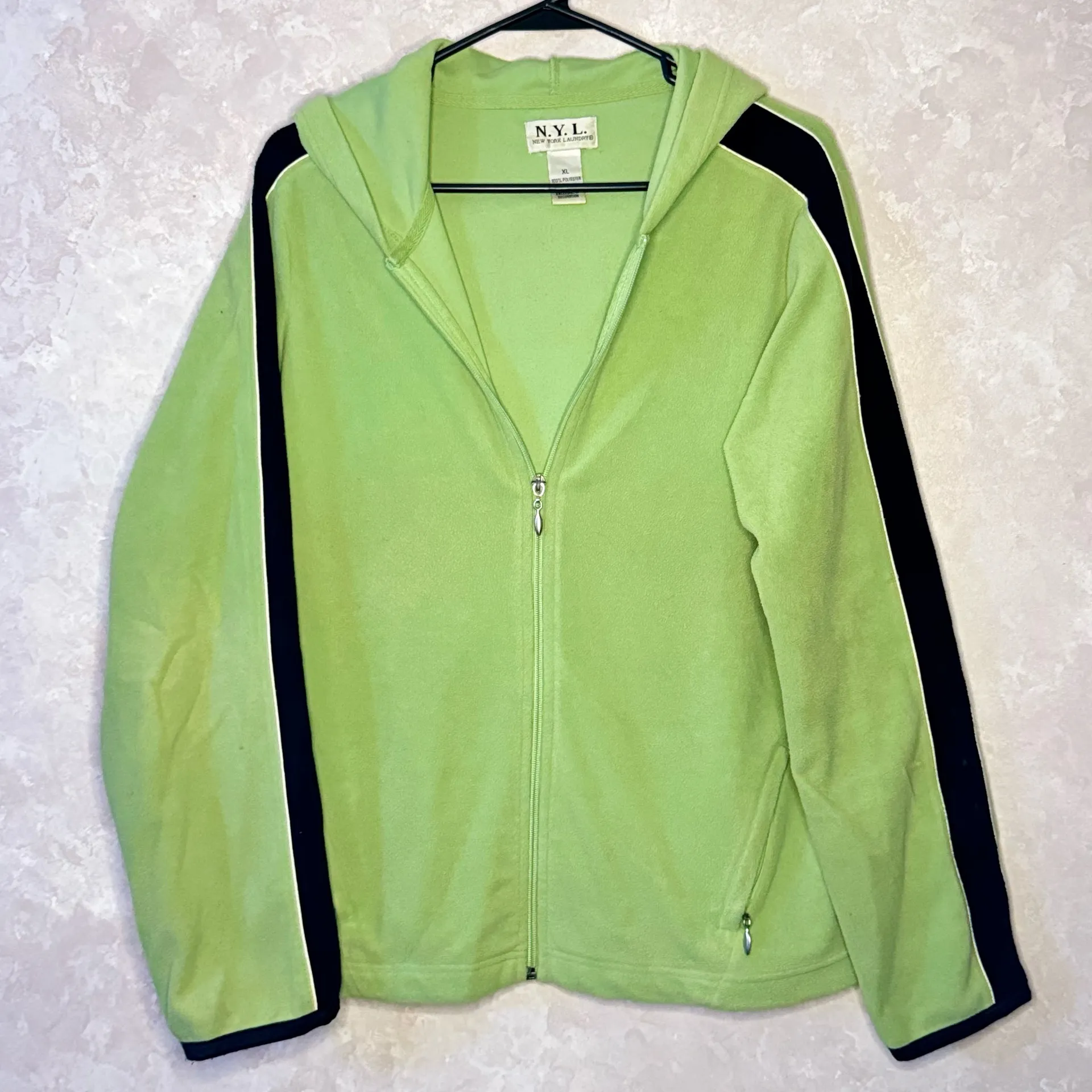 sweet and cozy fleece spring green and navy blue zip up hoodie light signs of wear in the elbows, lots of life left! brand: New York Laundry tagged size: XL, fits like Large #fleece #zipup #spring #green #hoodie