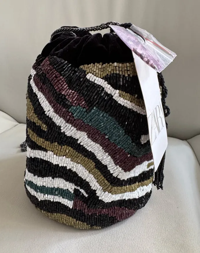 Beautiful new beaded bucket bag by Zara in multicolor beads and black velvet Perfect for the holiday... Show more