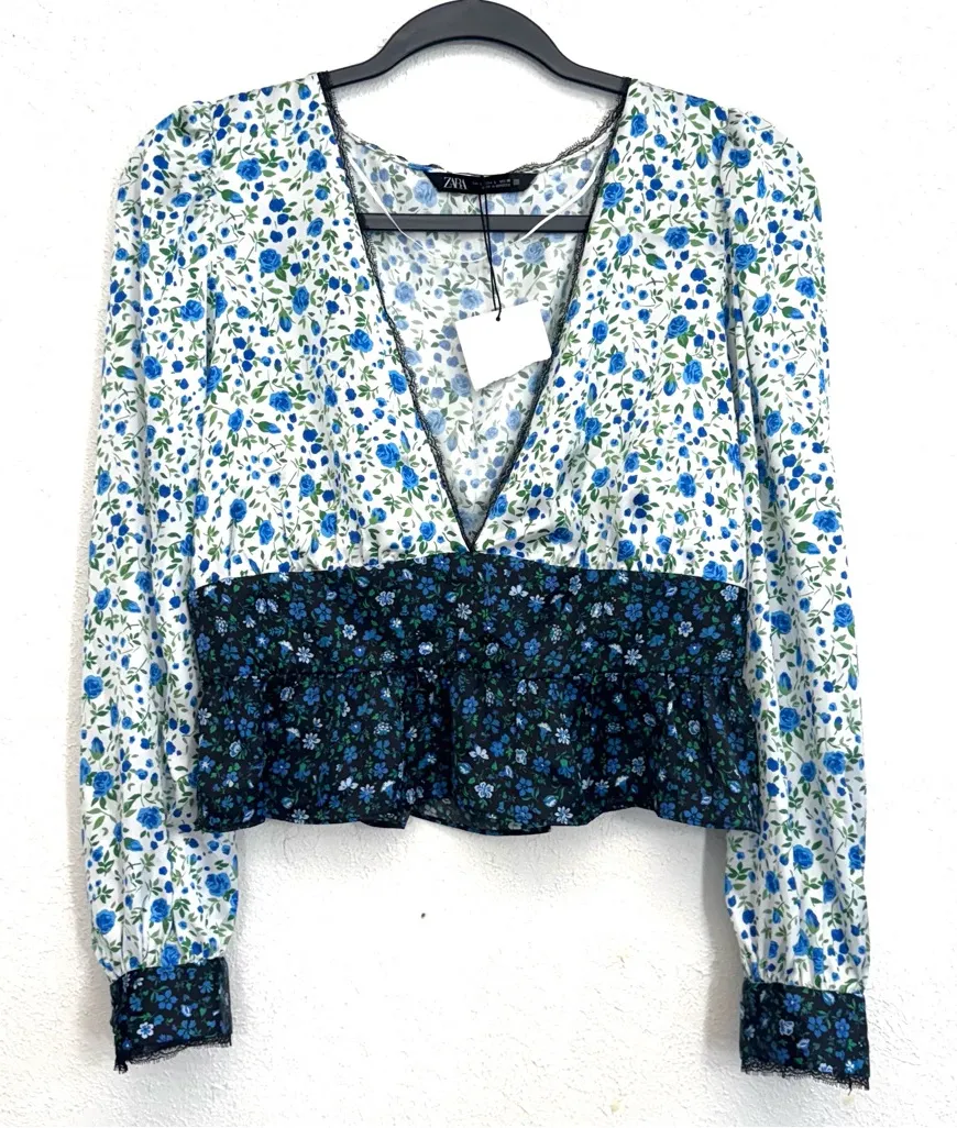 Zara Ditsy Floral Lace Smocked V-neck Long Sleeve Blouse New with ripped tag Size Large Blue and gr... Show more