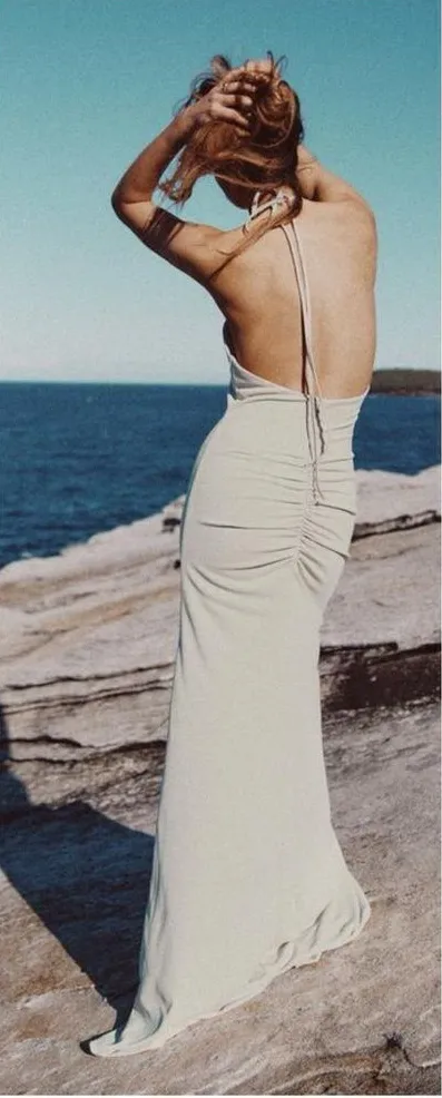 Long dress in knit fabric. Halter neck with tie and opening on the chest. Draped fabric detail. Matc... Show more