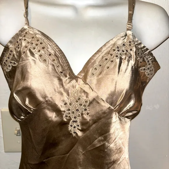 Brand - Newport News Size -6 Color - Gold Style - lingerie slip nighty nightgown teddy Condition- NWTS Length - long ankle Sleeve- adjustable straps sleeveless Features - Beaded sequins Material- satin Flaws - none new