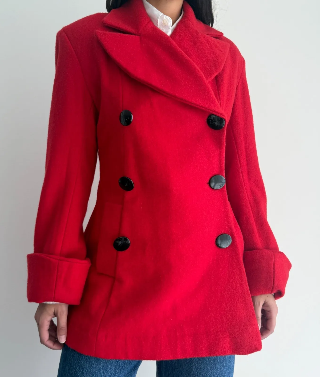 Stunning red wool blend pea coat with a double button front double button front closure, side pockets and a stunning pleated back detail Fully lined. Slight a line/ swing fit 70% wool 25% nylon 5% other fibers Gently pre owned condition, light surface scratches on 2 of the buttons. ----------------------------------------- Size 6 please compare measurements to determine fit. Measurements taken flat Armpit to armpit 18.5' Shoulder to hem 29'' Shoulder to shoulder 16.5'' Waist 17' Model's measurements - 5.6 height - bust 32'' - waist 26'' - hip 38'' Minimal minimalist capsule relaxed fit trendy fall cozy autumn overcoat winter elegant princess maximalist