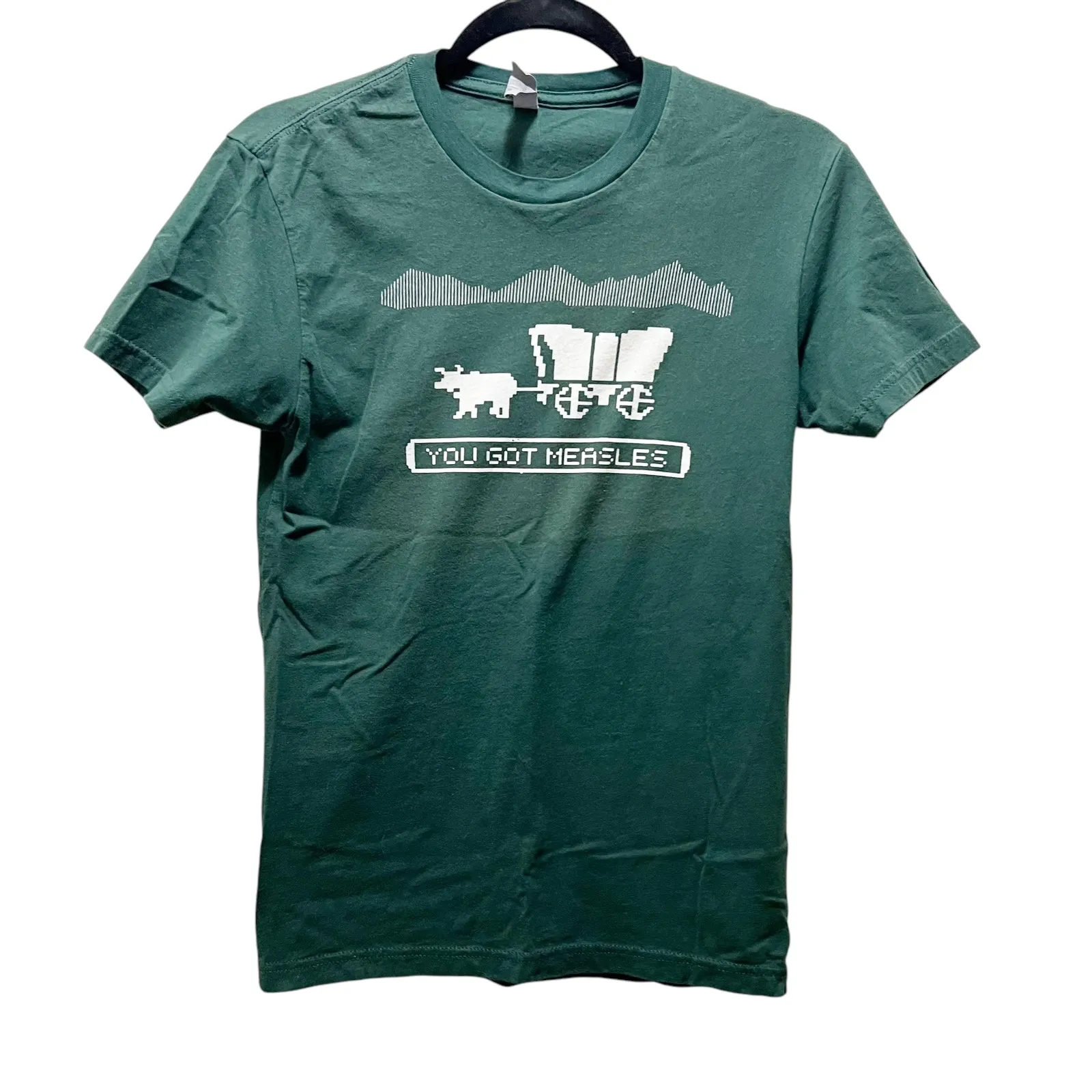 Relive the nostalgia with this Oregon Trail Adventure Game T-Shirt! This short-sleeve tee features a funny graphic that any fan will appreciate. Size: XS Color: Green Perfect for casual wear, gaming events, or just showing off your love for classic computer games. Grab this unique piece and hit the trail!