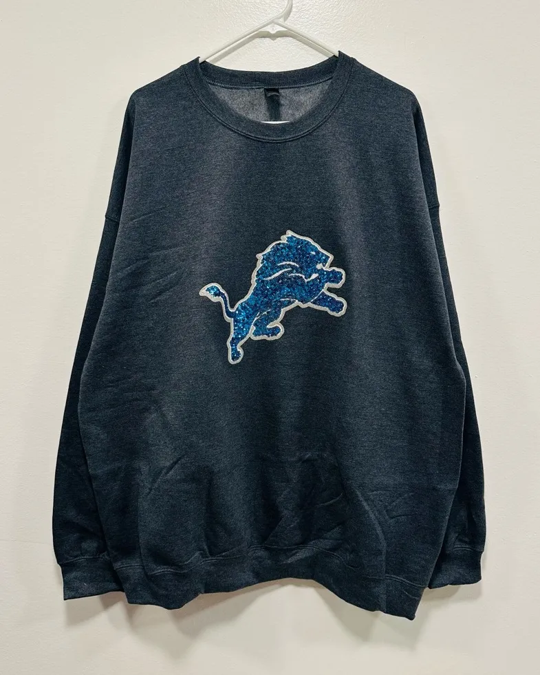 Comfortable crewneck sweater by Gildan. Features a bold blue lion design. Ideal for casual wear.