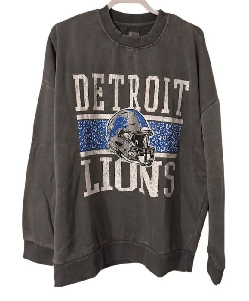 Keywords: fleece sweater, pullover, men's fashion, casual wear, fall clothing, crew neck, ribbed cuffs, sports theme, vintage style, machine washable, solid gray, long sleeve, XL size, comfortable fit, new with tags, NFL, football, NFC North.