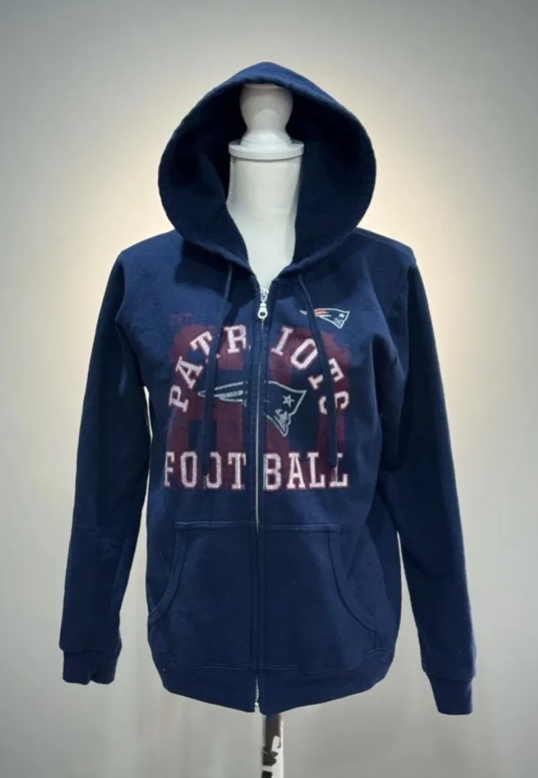BRAND: NFL Team Apparel SIZE: M CONDITION: EUC COLOR: Navy MEASUREMENTS: 20.75” pit to pit, 24” shoulder to hem, 19” sleeve inseam MATERIALS: 50% cotton, 50% polyester CARE: Unknown NOTES: front pockets, full zip, drawstring hood