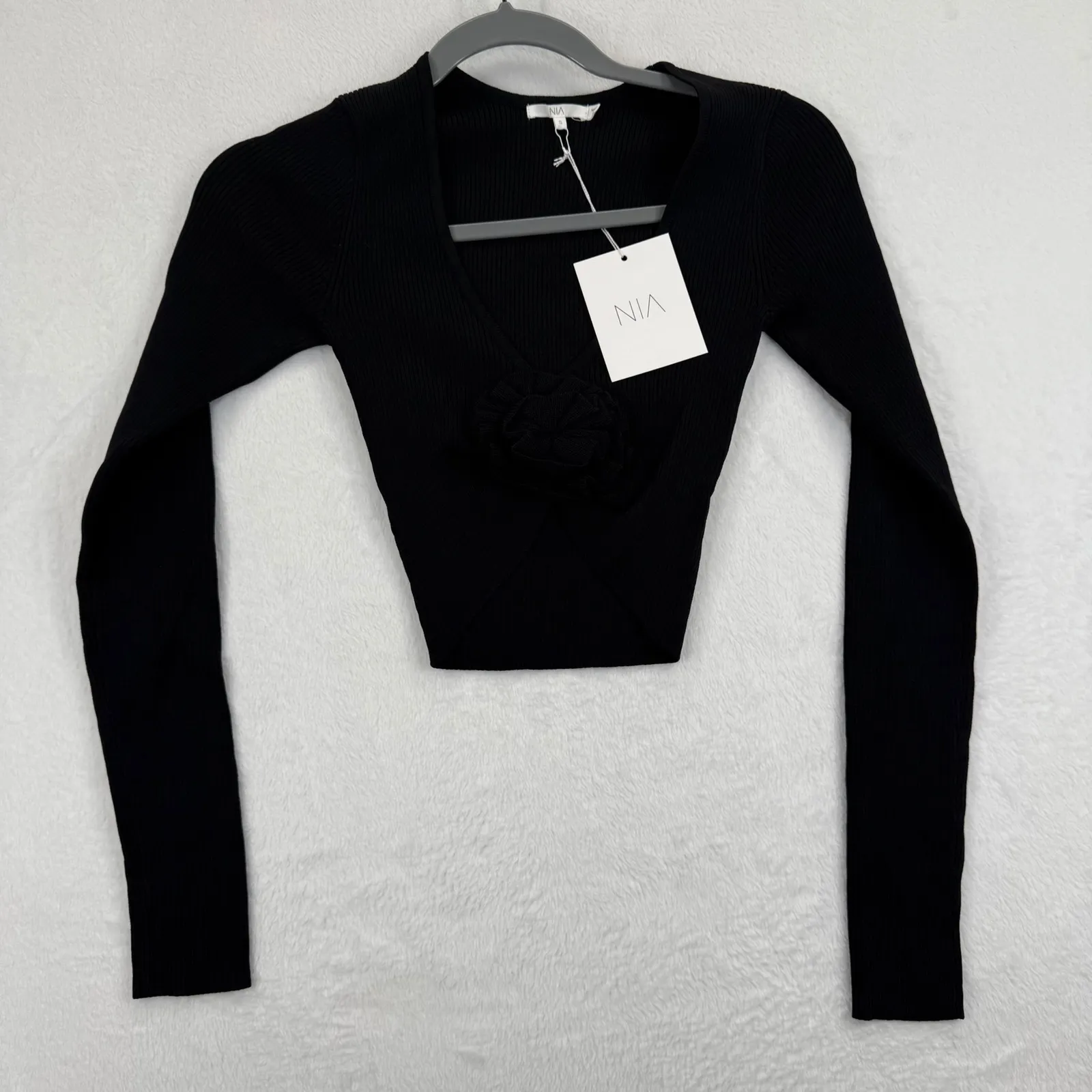 Color: Black Type: Blouse Department: Women Style: Cropped Material: Viscose Blend, Nylon Neckline: V-Neck Sleeve Length: Long Sleeve Sleeve Type: Classic/Fitted Sleeve Accents: Button, Ruffle Pattern: Solid Features: Ribbed, Crop Top, Stretch, Lightweight, Fitted Fit: Slim Keywords: NIA top, black crop top, ribbed knit top, long sleeve top, floral detail top, womens top, size small, black blouse, knit top, contemporary fashion, casual top, new with tags Thank you for viewing my listing! Please see the photos for a detailed look at its CONDITION and MEASUREMENTS. All preowned items have been steam cleaned and/or washed. Feel free to reach out with any questions.