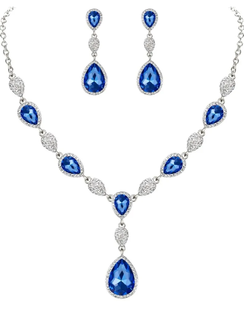 This stunning jewelry set features a beautiful combination of blue and silver tones. Perfect for adding a touch of elegance to any outfit. EleQueen Women's Cubic Zirconia Teardrop Y-Necklaces Dangle Earrings Jewelry Sets for Brides Bridesmaids