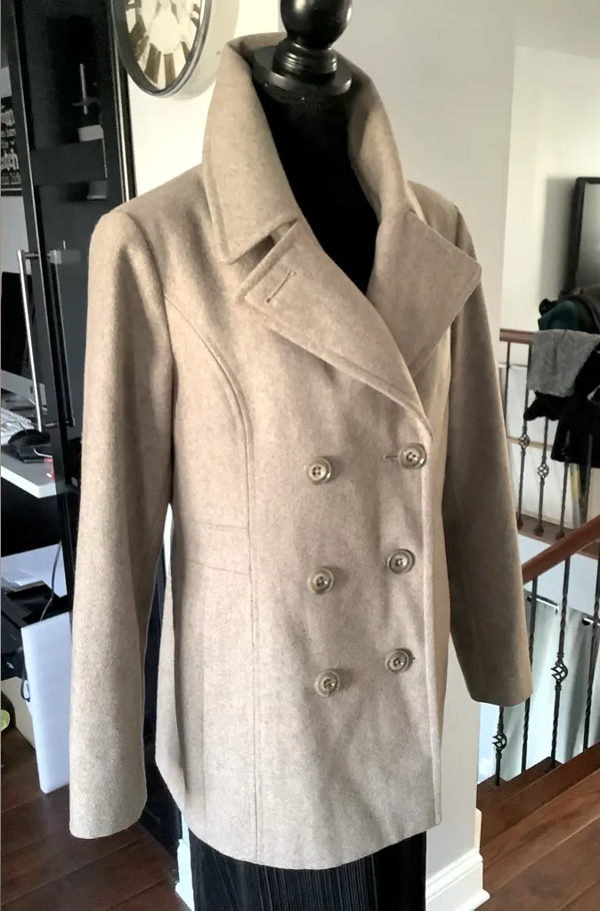Dressy, clean and dressy looking wool blend peacoat in like new condition. Stylish, elegant and pretty. Light oatmeal color. I also have very well matching hat ( listed separately) for sale, check my closet, bundle and save.