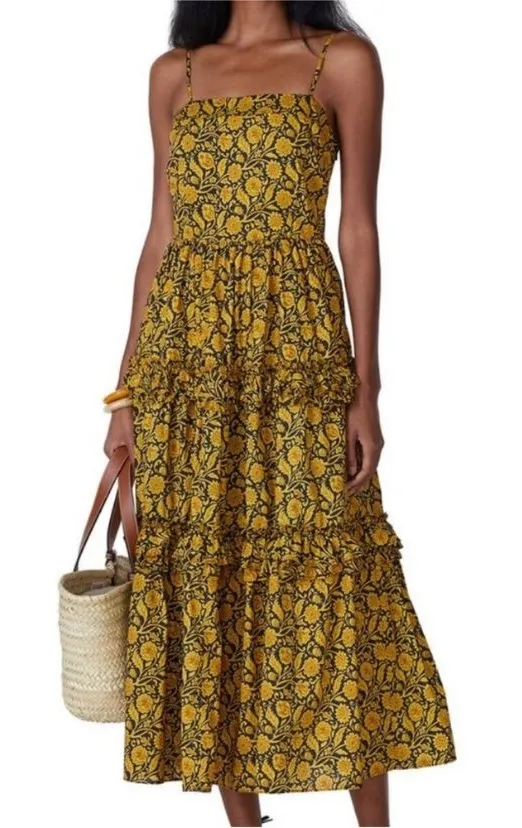 Gently used Bohemian florals are in bloom on this straight-fitting Nicholas dress finished with a flirty ruffle hem. Black and yellow printed cotton (100% Cotton). Maxi. Sleeveless. Square neckline. Center back zipper closure. Size 4 Bust 29" Waist 24" Hips36" Length 50.5" shoulder to hem All Measurements Are Approximate Fabric Content 100% Cotton We appreciate you checking out The Vintage Fern! Please feel free to send an offer via the offer button!