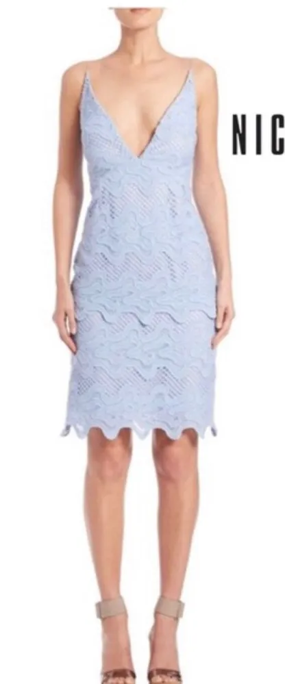 Size 8 US. Great condition. Designer dress in double-layer guipure lace from Australian label Nicholas styled with a plunging deep v-neckline, spaghetti straps & symmetrical scalloped hem in pale Cashmere Blue. Sleeveless fitted bodice nips in at waist, finishing in a ever-so-slightly flared pencil finish. Lined. Hidden back zip. Party wedding guest bachelorette bridal shower prom homecoming