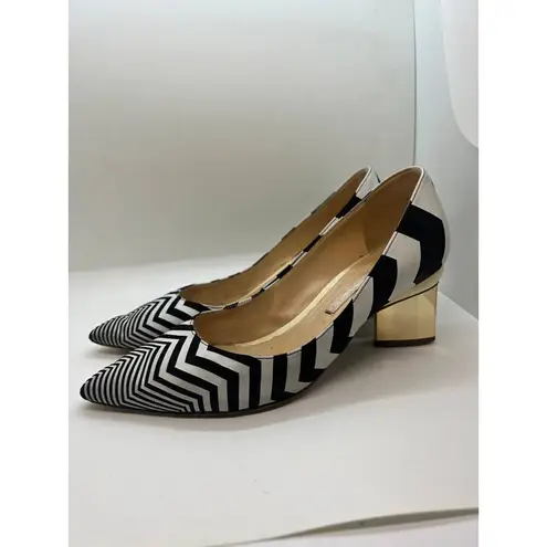 Nicholas Kirkwood Chevron Prism Pump Sz. 36 Retail $695 GENERAL INFO: Winner of the BFC Vogue Fashion Fund Award Nicholas Kirkwood creates shoes with outfit-transforming appeal. These pumps have been hand-crafted from white leather and black suede to create a striking zigzag effect. - Triangular gold heel measures approximately 2.5 inches - Black and white zigzag print suede, leather (Kid) - Pointed toe - Slip on CONDITION: Notice that toe is slightly different than original--one piece has scuffed and I removed the first little piece of white stripe to even them out---some spots in places--not new but are stunning and have a TON of life left! See all pics please.