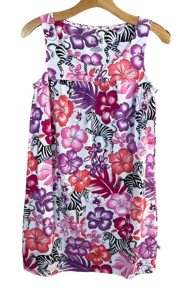 Very good condition! No rips, tears, holes or stains. Pullover Scoop neck with 2 button closure Pink, purple, black, white multicolor novelty print Sleeveless Mini length Sleep, pajamas Cotton, spandex blend - machine wash underarm to underarm: 16.5 in length (shoulder to hem): 33 in