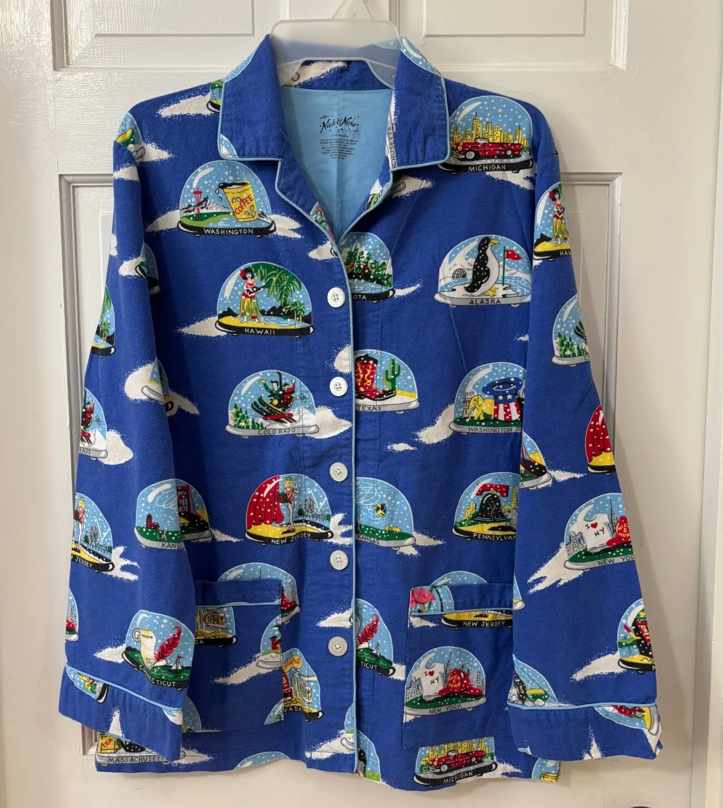 Measurements: • Chest: 20 in • Length: 27 in • Sleeve Length: 23 in Type: Pajama Top Department: Women Theme: USA, City, Animals, Nature Pattern: Graphic Print Material: 100% Cotton Fabric Type: Flannel Sleeve Length: Long Sleeve Closure: Button Season: Winter Accents: Button, Logo, glitter Keywords: pajamas, sleep shirt, loungewear, travel, states, novelty print, button down, long sleeve, cotton, casual, cozy, gift, homewear, Christmas, Holiday, winter, snow