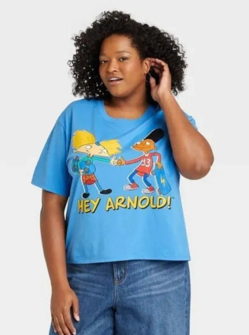 NWT: new with tag! Blue short-sleeved crewneck tee with a short cropped length and front Hey Arnold!... Show more