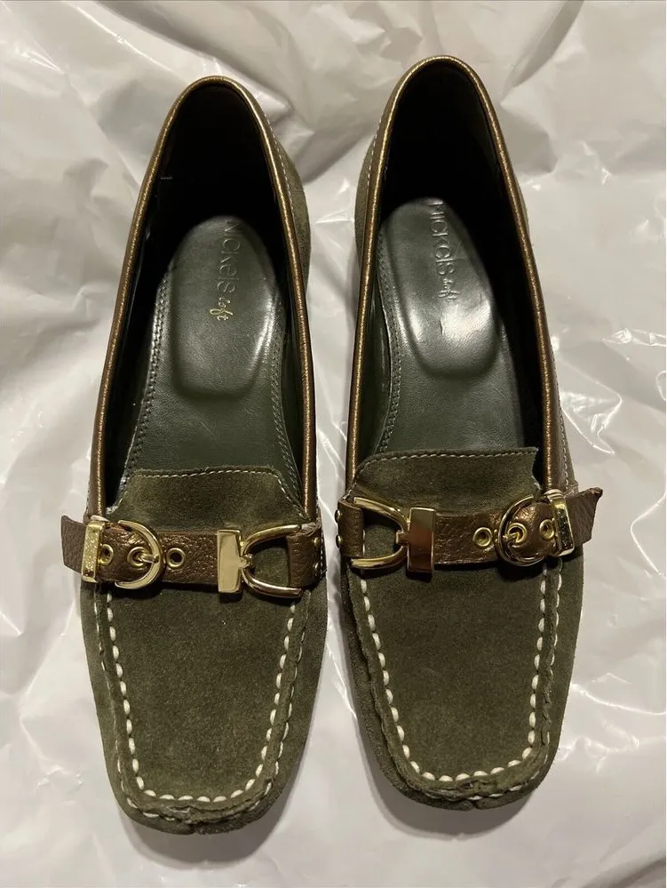 Elevate your style with these stunning Nickels Solstice slip-on loafers. The olive green suede upper, combined with gold trim, gives a fashionable and elegant touch to any outfit. These shoes are designed for women, with a US shoe size of 7.5 and a medium width. The Nickels Solstice model boasts a metal theme, with arch support and non-slip features for added comfort. These shoes are perfect for casual wear, and the vintage style adds a unique touch to your wardrobe. Slip into these stylish loafers and experience the perfect combination of fashion and comfort.