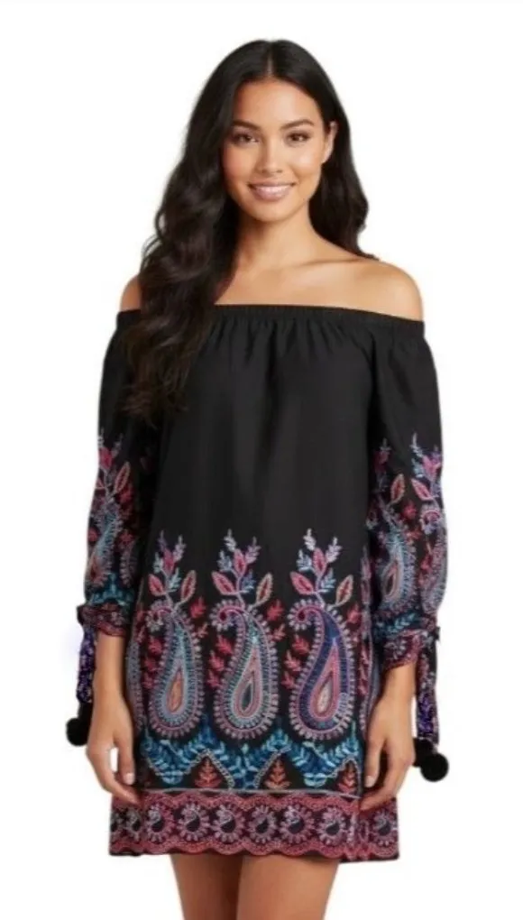 Nicole Miller Black Boho Embroidered Off The Shoulder Mini Dress 10 Festival Whimsy This Nicole Mi... Show more