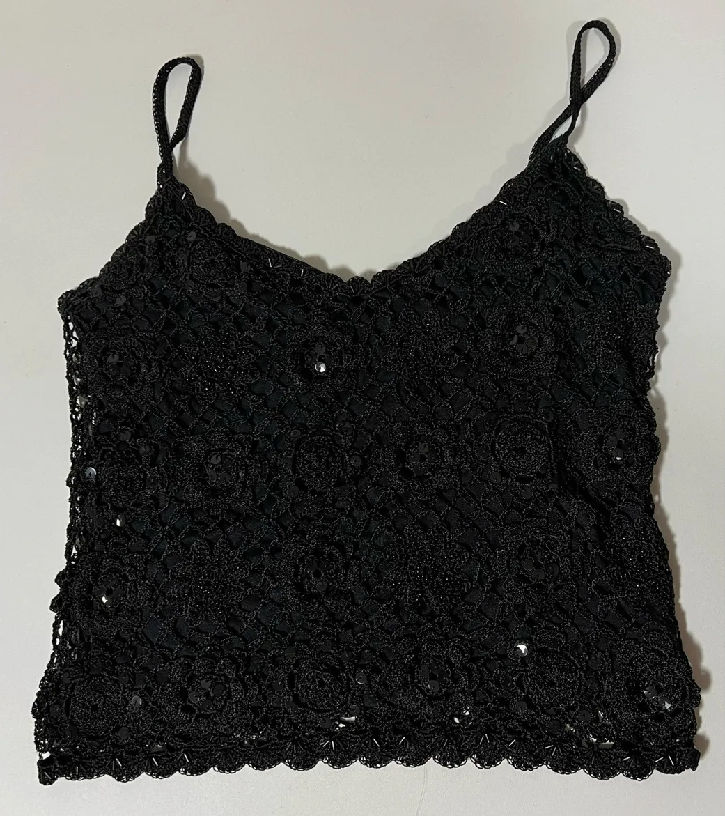 Nicole Miller Black Floral Crochet Beaded Tank Top Shirt Blouse Size S 🖤 #crochet #blouse #shirt #t... Show more