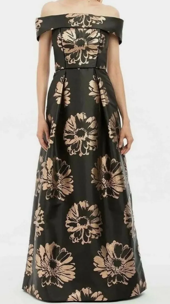 The Nicole Miller formal gown is a stunning size 2 dress featuring a floral pattern with gold velvet... Show more