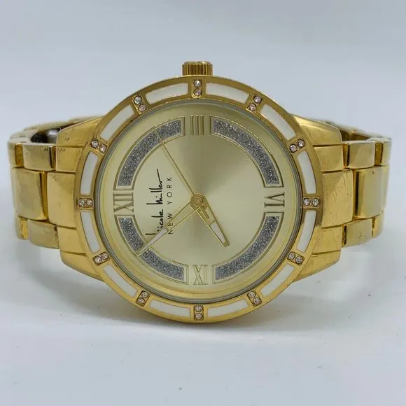 Nicole Miller New York 36mm Womens Gold tone Dial analog Quartz Watch bracelet size 6”, in good use... Show more