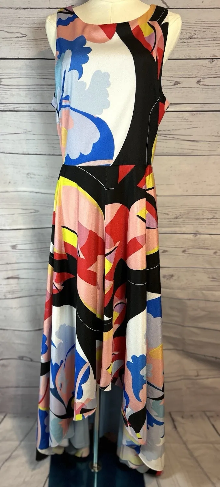 Vibrant sleeveless maxi with an abstract floral print, side zipper, bra holders under the sleeves, a... Show more