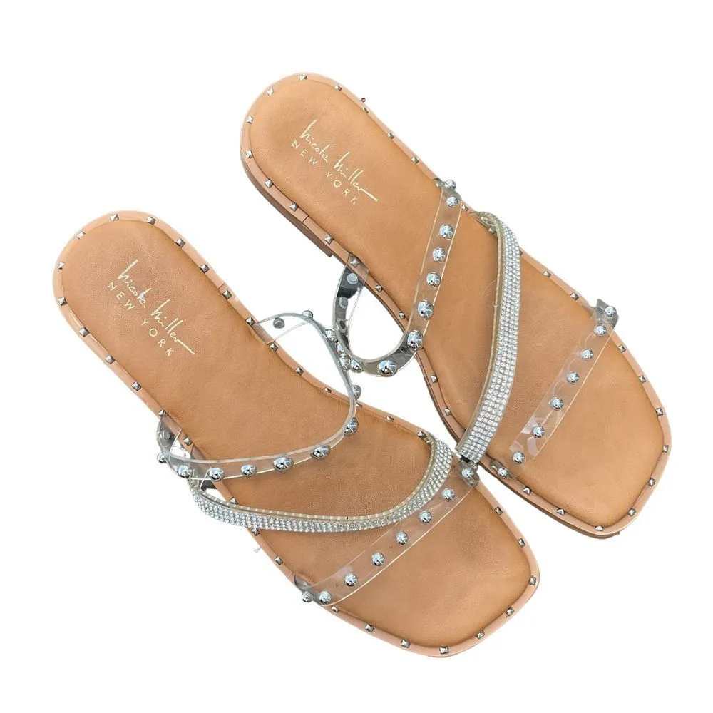 Nicole Miller New York Strappy Studded Rhinestone Slip-On Sandals Size 10 Tan/ Beige/Silver Slip-on... Show more