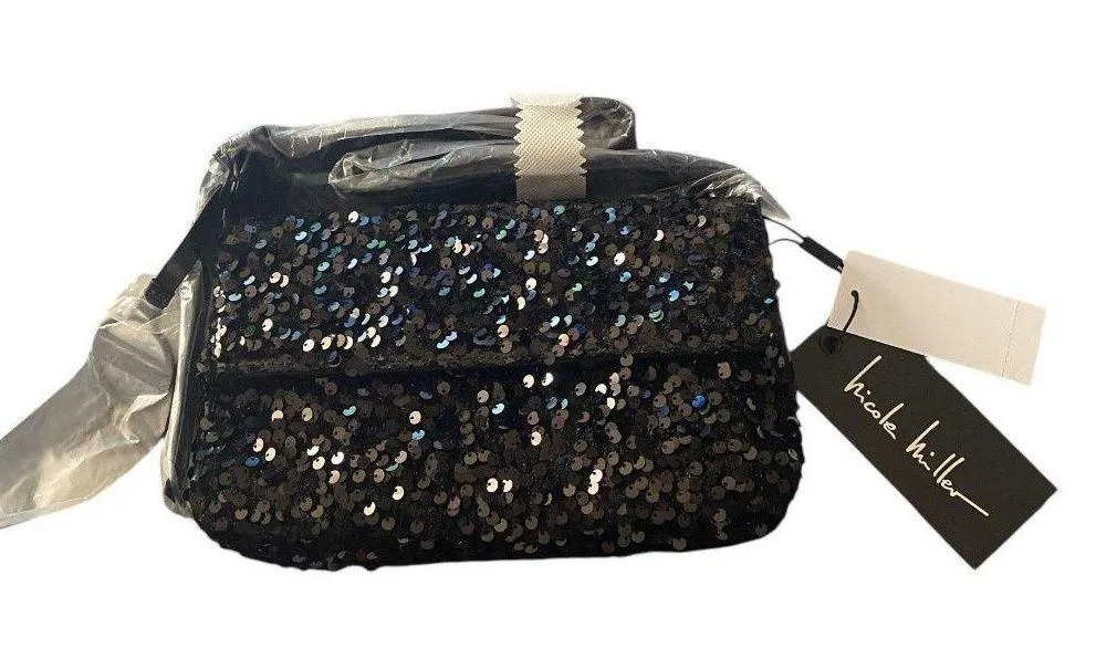NWT-NICOLE MILLER-BLACK SEQUIN HANDBAG Gorgeous black sequin handbag with shoulder strap, front flap... Show more