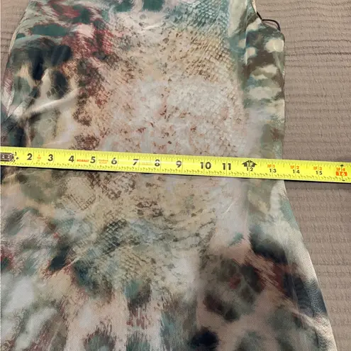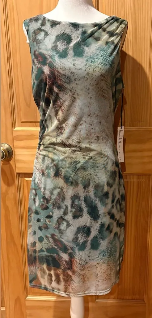This Nicole Miller sleeveless cowl/scoop neck bodycon dress featuring an abstract animal or snakeski... Show more