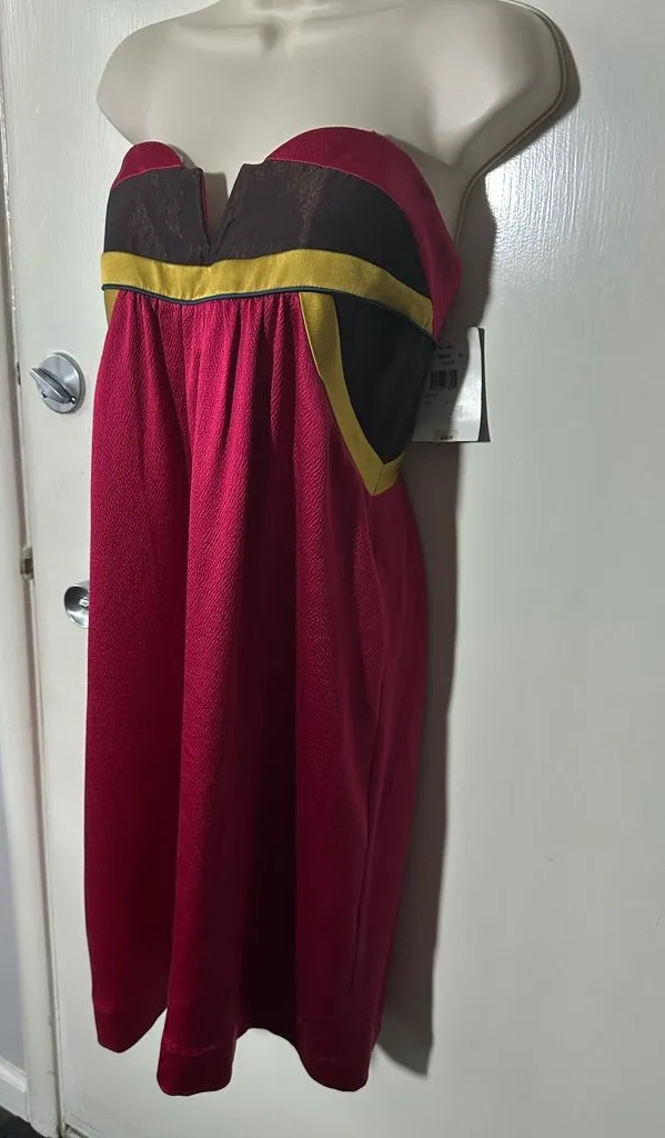 Chic strapless dress by Nicole Miller. Features a vibrant red body with stylish brown and gold accen... Show more
