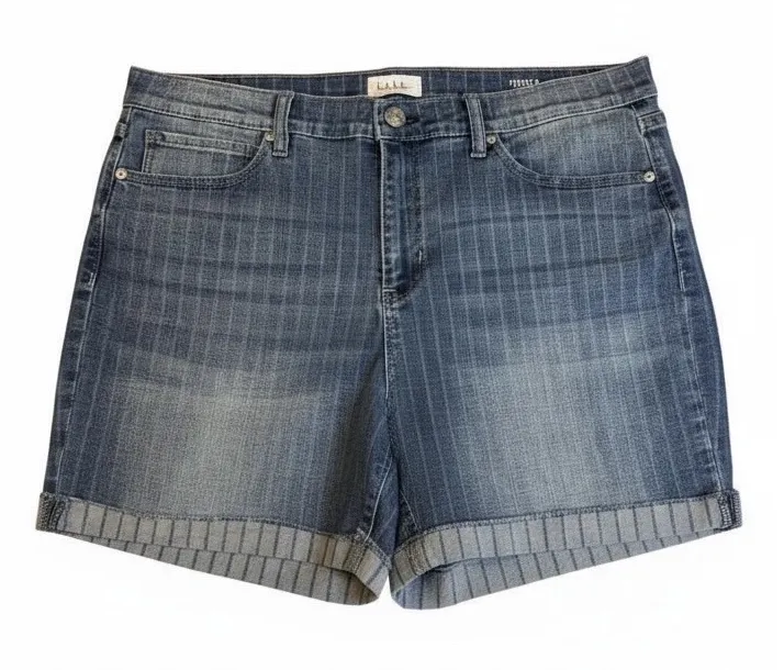 The Nicole Miller Women's Pinstripe Tribeca Rolled Cuff Mid Rise Denim Shorts in size 16 are a styli... Show more