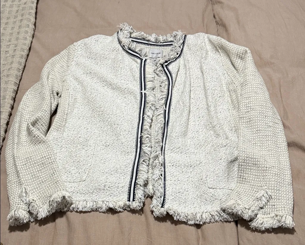Chic Cream with Blue Trim Tweed Jacket with Fringe Trim Black Size XXL - $19 - From Janice