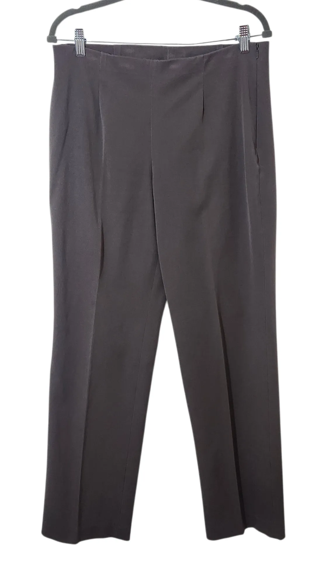 These Nic + Zoe straight-leg pants feature a versatile gray shade with warm brown undertones and a side zipper for a polished, streamlined fit. Perfect for the office or a casual dinner, they pair effortlessly with blouses, sweaters, or tailored jackets. Pre-loved with some wear on the waistband. Style: Straight-leg pants Color: Gray with brown undertones Size: 10 Special Features: Side zipper, straight-leg fit Condition: Pre-loved, some wear on waistband Same-day shipping for orders received on weekdays by noon CST. Measurements shown in images and are taken while laying flat. 2509-31