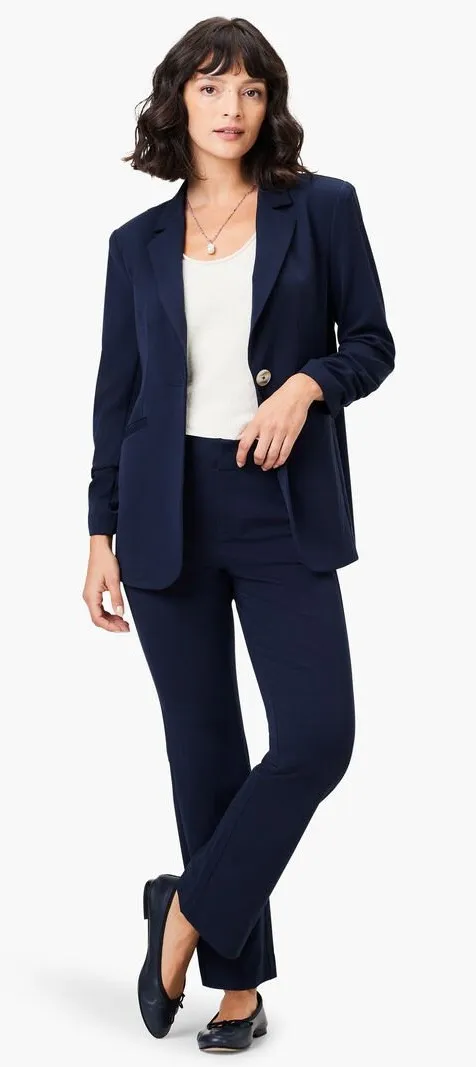 Easy elegance ready to dress up or down that's also the comfiest thing in your closet? Right this way please. We gave the Plaza Pant a subtle bootcut shape and a little bit of stretch to keep things comfortable and easy. A hook and bar closure and classic fly front at the waist keeps the design sleek and the patch pockets add a touch of utility. $148 Slim through the hip + knee into a kicked out leg opening Boot leg Ankle length Missy: 28" long Sits slightly below waist Fly front with hook and bar closure Patch pockets Woven pant Machine wash cold with Like colors. Gentle cycle. Do not bleach. Line dry. Cool iron if needed. 56% Cotton/ 37% Rayon/ 7% Spandex Keywords: Blazer, Suit Set, Pants Suit, Navy Blue, Professional Attire, Career Wear, Office Outfit, Workwear, Business Casual, Dress Pants, Jacket, Matching Set, Women's Suit