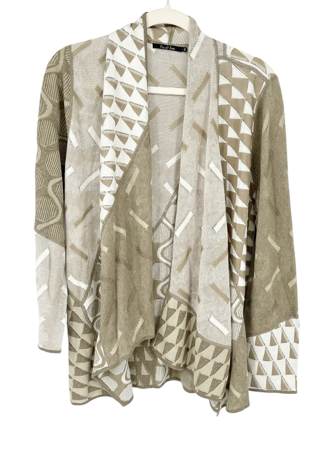 Nic + Zoe Womens Geometric Print Open Front Layered Cardigan Sweater in Beige and Cream. Size 1X. Good preowned condition. No visible flaws. -Geometric Print -Long Sleeve -Draped -Open Front -Knit -42% Rayon, 34% Cotton, 12% Viscose Tags- Cozy Warm Fall Winter Autumn Cold Season Chilly Day Cold Weather Snow Frosty Air Mornings Homey Casual Leisure Everyday Weekend Vacation Travel Saturday Sunday Warm Work Stroll Layer Thermal Comfy Loungewear Leisure Holiday Approximate Measurements While Laying Flat: Pit To Pit: 18.5" Length: 28" All Items Come From A Smoke Free Home ! All Reasonable Offers Welcome !