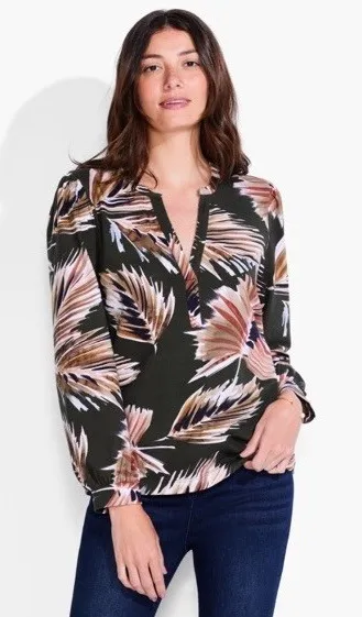 This vibrant NZT by Nico Zoe top is a lightweight, easy-to-wear blouse featuring an abstract palm leaf print in earthy tones of olive, beige, blush, and black. The top offers a comfortable fit with a touch of stretch thanks to its cotton/spandex blend, while details like a gathered shoulder, long sleeves, and a V-notch neckline add feminine flair. A great piece to dress up jeans, pair with linen trousers, or wear with shorts for a resort-ready look. • Material: 95% Cotton, 5% Spandex • Neckline: Split V-neck • Occasion: Casual, Travel, Resort • Condition: New with tags • Made in: India • Care Instructions: Machine wash cold, tumble dry low, cool iron if needed Measurements (laid flat): • Pit to Pit: 17.5" • Length: 24.5" Tropical, Leaf Print, Boho Chic, Casual Resortwear, Earth Tone Style, Botanical Print, Lightweight Cotton Top, Fall Colors