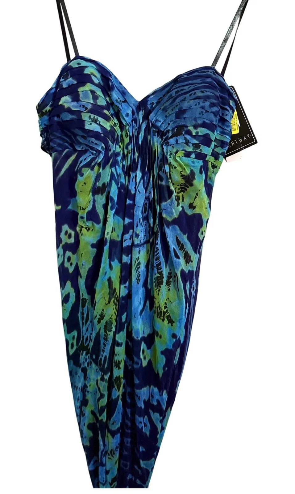 Capture attention in this stunning Nightway strappy maxi dress. Its captivating ombre design, featuring vibrant blues and greens, flows gracefully with a flattering ruched bodice and a dramatic tie at the hem. The delicate spaghetti straps add an elegant touch, making this dress perfect for a summer wedding, a sophisticated evening gala, or a tropical vacation. Measurements: • Bust: 15 in • Waist: 13 in • Length: 57 in Style: Maxi, Sundress Dress Length: Long Department: Women Sleeve Length: Sleeveless Pattern: Tie Dye Occasion: Party/Cocktail, Casual Material: Rayon Fabric Type: Chiffon Theme: Beach, Retro, Sexy, Tribal Neckline: Sweetheart Season: Summer Sleeve Type: Strappy Sleeve Closure: Zip Accents: Ruched, Layered Keywords: Nightway dress, strappy gown, ruched bodice, ombre print, tie hem, evening wear, formal dress, special occasion, summer fashion, elegant, fashionable, party dress, women's fashion