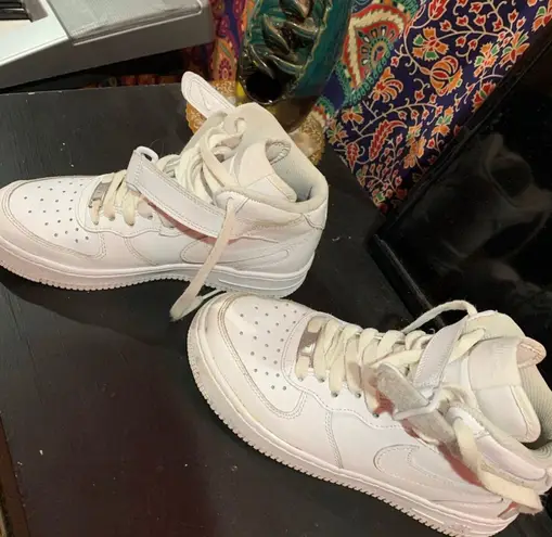 White, high tops with a Velcro strap!! They are in beautiful condition, lightly worn and COMFY! Bro... Show more