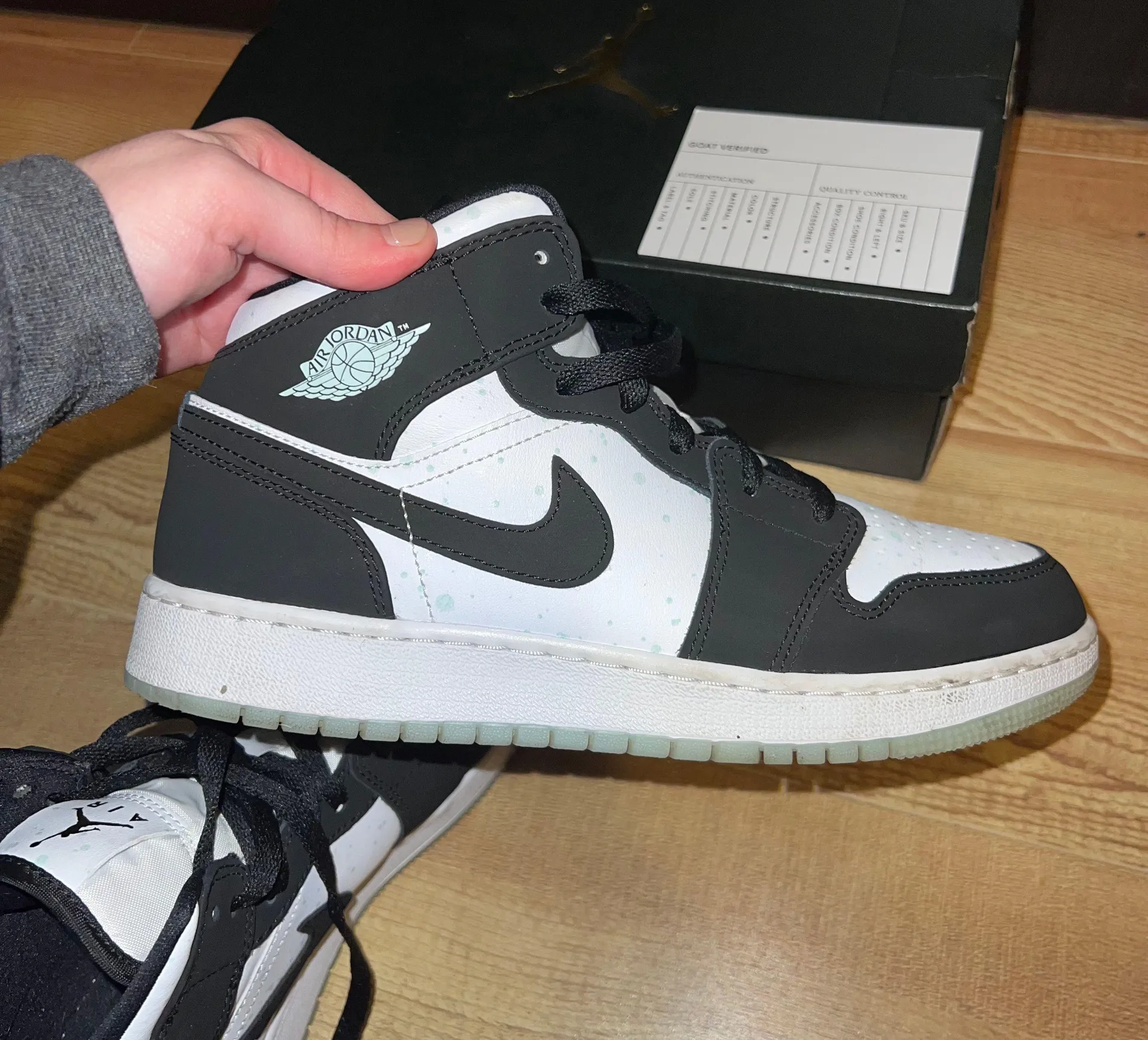 Nike Air Jordan’s with a glow in the dark logo and paint splatter patterns around the shoe Very good... Show more