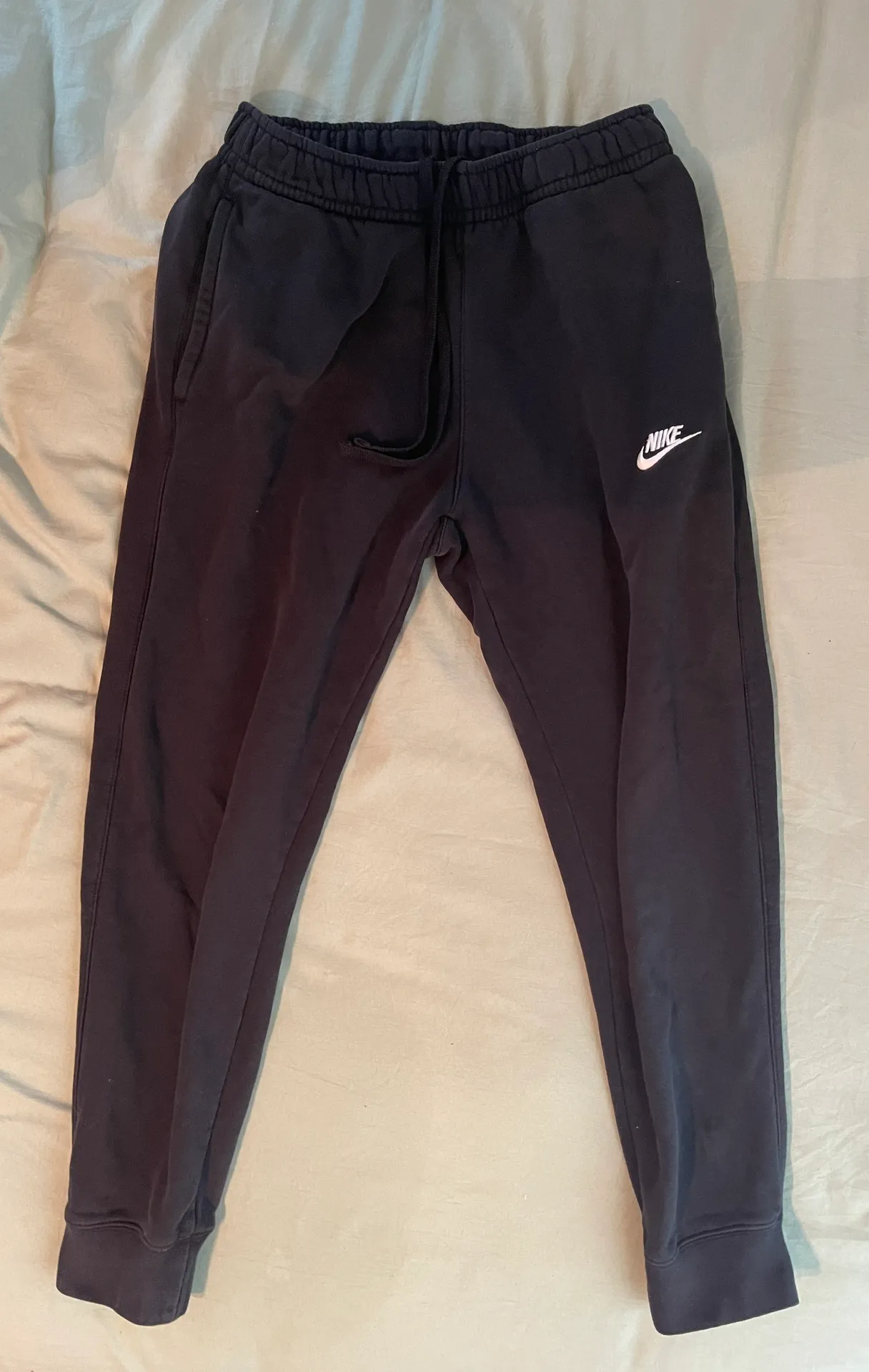 Black Nike joggers with white embroidered Nike logo. Super comfy and warm. •Barely worn • Good cond... Show more
