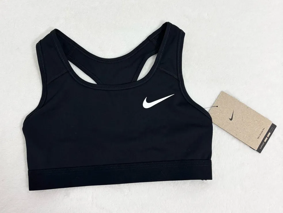 Sleek black sports bra with iconic white Nike logo. Ideal for active lifestyles. New with tag Plea... Show more