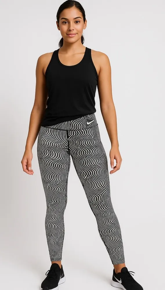 Elevate your activewear with these Nike Dri-Fit Leggings in a striking black-and-white swirl stripe... Show more