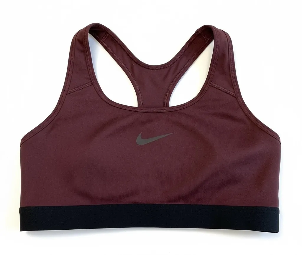 Keywords: Nike Dri Fit, Sports Bra, Medium Support, Racerback, Maroon, Black Band, Women's Activewear, Workout Top, Gym Wear, Running Gear, Yoga Apparel, Athletic Bra, Performance Wear, Comfortable, Stylish