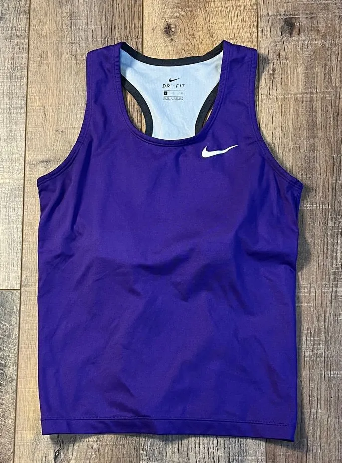 Sleek Nike tank in deep purple with built in sports bra. Features iconic swoosh logo. Excellent preo... Show more