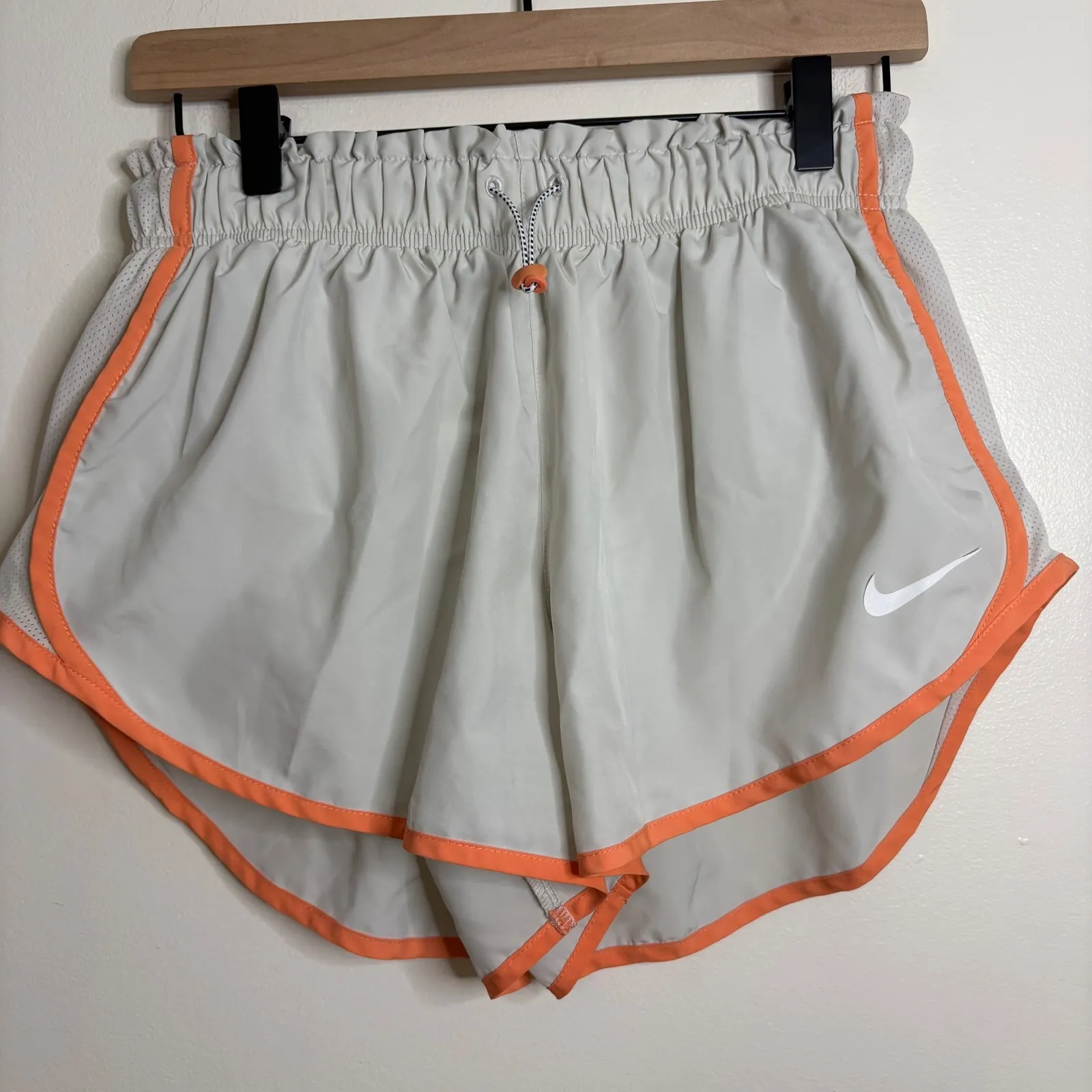 Women's Nike Dri-FIT running shorts in light gray with vibrant orange trim. These athletic shorts fe... Show more
