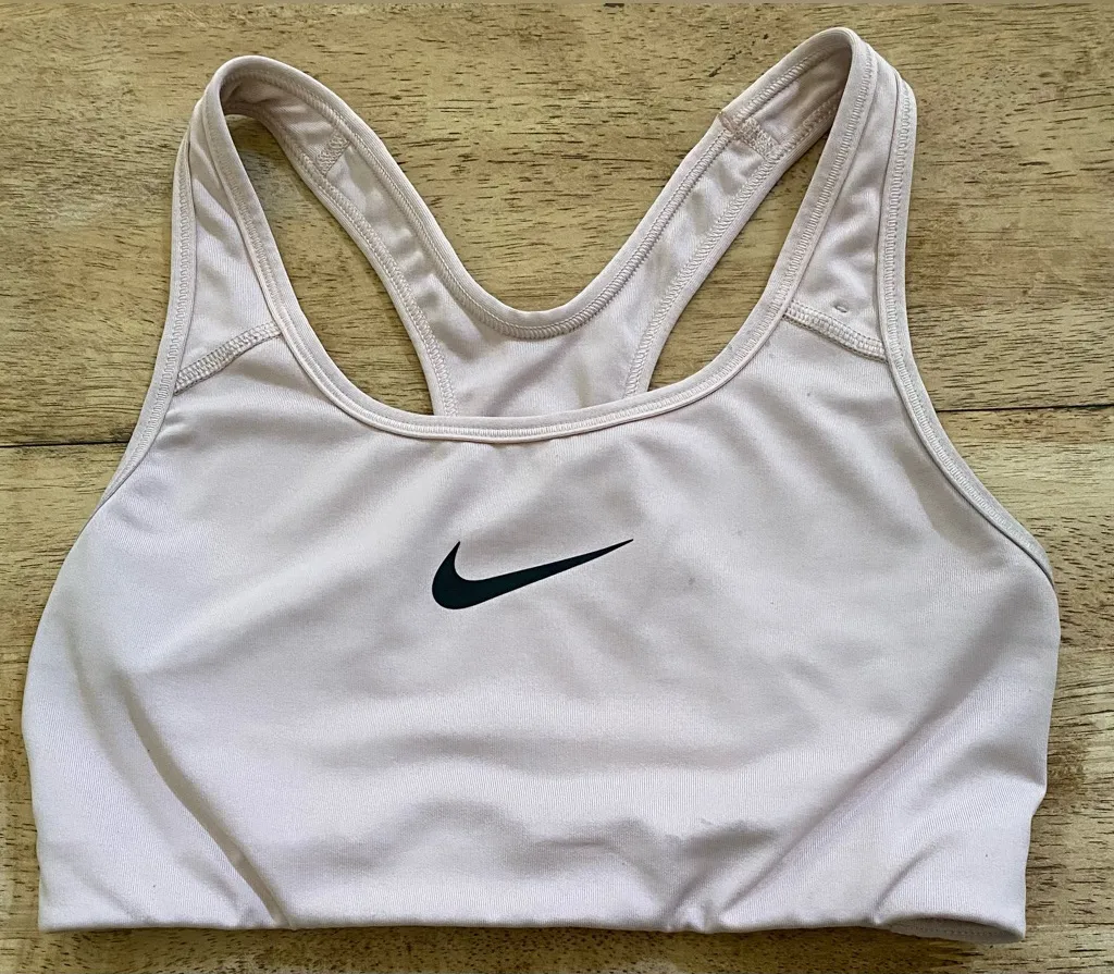 Nike women’s size small athletic bra. Top features a poly/spandex blend blush pink stretch material;... Show more