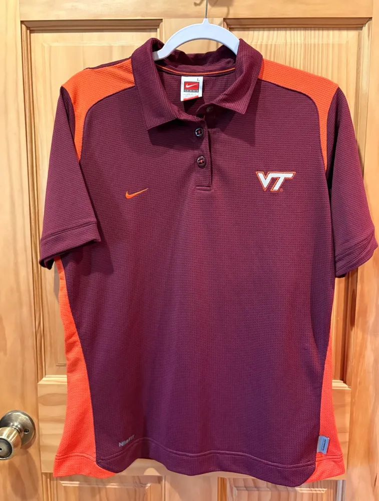 This women's Nike Dri-FIT polo shirt for the Virginia Tech Hokies is maroon with orange accents on t... Show more