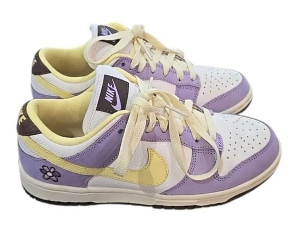 Chic Nike sneakers in lavender and cream. Features floral accents and a classic swoosh.