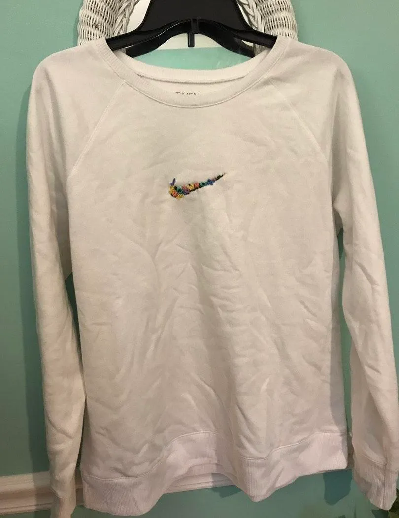 White Crew neck Nike symbol hand embroidered super cute never worn size L